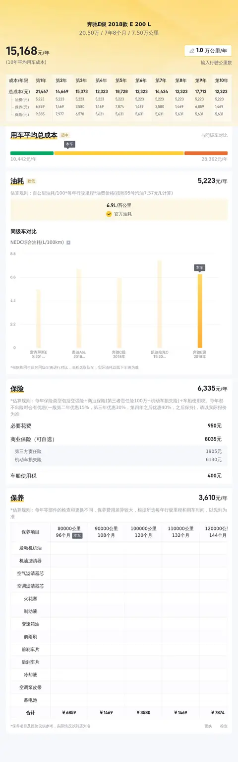 在用车成本方面,我们假设每年行驶2万公里(超过大多数人的日常使用需求),并按照懂车帝的标准算法,计算出了这辆车的10年平均用车成本大约为31109元/年。这一数字涵盖了燃油、保养以及保险费用等各个方面。值得一提的是,与同级别车型相比,奔驰E级的保养费用相对较低,这无疑为车主节省了一大笔开支。
