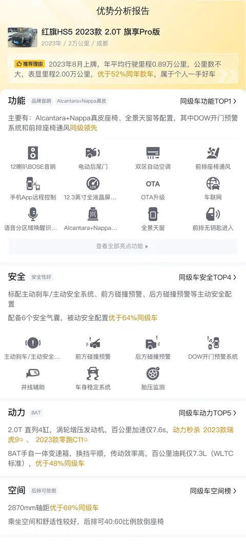 综上所述的新车含税价、用车成本、市场行情、优势分析、同款比价等数据仅供参考。在配置部分,因为二手车非标品,车辆可能会存在配置改装的情况,具体车况信息需要线下结合车辆实际情况进行综合参考。