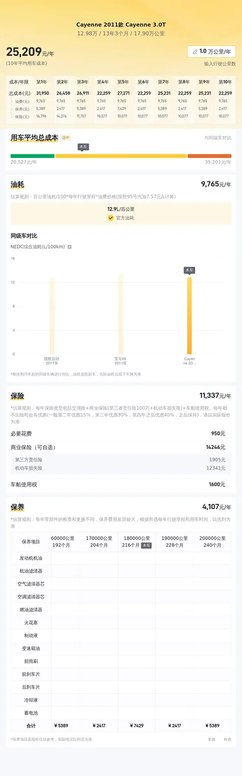 综上所述,这款Cayenne 2011款 Cayenne 3.0T作为一款二手豪华SUV,在市场上仍然保持着较高的性价比和市场竞争力。它在动力性能、内饰豪华感以及驾驶体验等方面都表现出色,是一款值得考虑的二手豪华SUV。