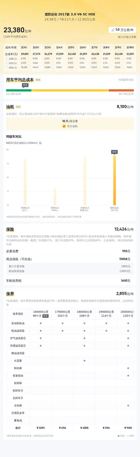 在用车成本上,这辆车的官方百公里油耗是10.7升,按每年行驶一万公里里程计算,燃油费用约为9473元,年度商业保险约9298元,每年保养费用约4318元,平均年度用车总成本约23089元,以上数据仅供参考,实际用车成本因用车场景和个人驾驶习惯而有所不同。