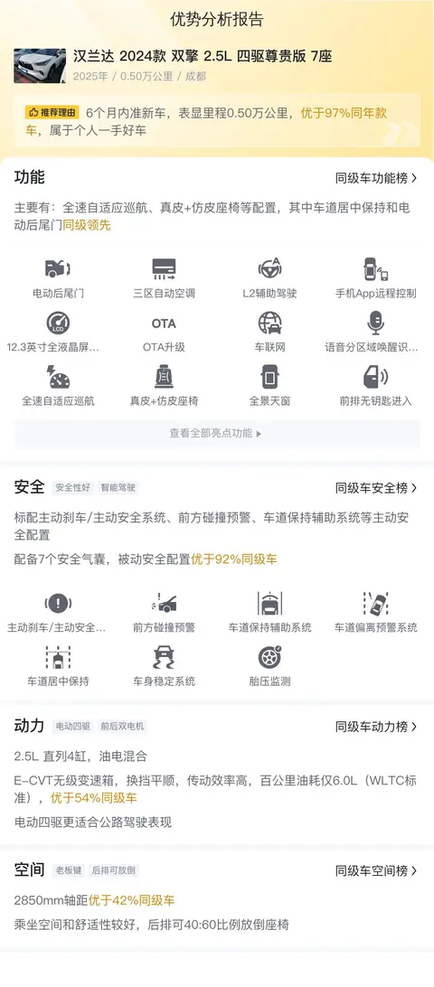 综上所述,汉兰达 2024款 双擎 2.5L 四驱尊贵版 7座在二手车市场上以其优秀的燃油经济性、宽敞舒适的乘坐空间以及全面的安全配置,展现出不俗的市场竞争力。其合理的用车成本和售价,使得它成为追求性价比的消费者们的一个理想选择。