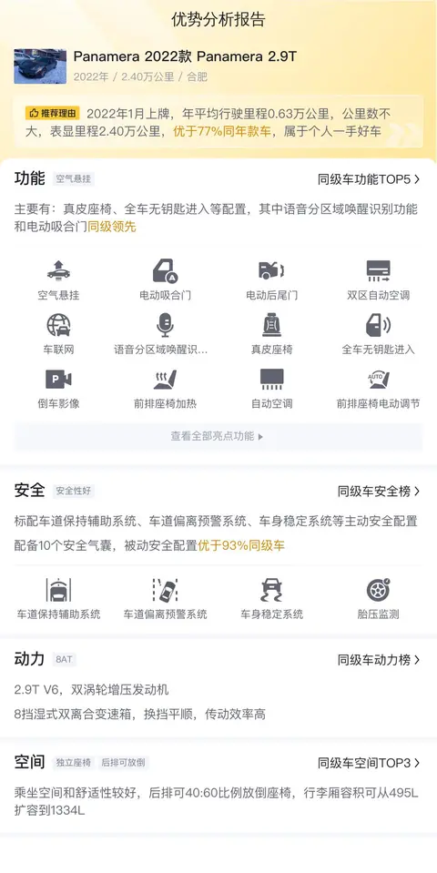 我们对比了全国范围内同款车型的售价,发现这辆车的售价相对较低,是一个不错的机会。作为一款豪华轿车,Panamera在市场上的保值率一直保持着较高的水平。选择这款车,不仅能够满足您日常驾驶的需求,还能在未来的换车之路上减少损失。此外,Panamera的舒适性和空间表现也得到了消费者的高度评价。无论是家庭出行还是商务接待,它都能提供宽敞舒适的乘坐环境。综上所述,这辆二手保时捷Panamera是一款集豪华、性能和舒适于一体的座驾。它在外观、动力、配置等方面均表现出色,同时保值率和市场口碑也相当不错。如果您正在寻找一款既能满足日常驾驶需求又能提升生活品质的车型,那么这辆二手保时捷Panamera绝对是一个值得考虑的选择。