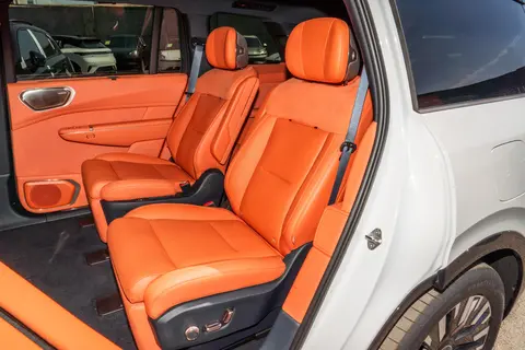 打开车门后,领克 900 的内部空间优势便直观展现出来。5240 毫米的车长与 3160 毫米的轴距,使其内部空间得房率达到 88.2%,再加上纯平的地板设计,车内活动空间十分充裕,1.3 米左右的儿童可在车内站立走动,前后排乘客换位也很方便。车辆全系采用 2+2+2 的六座布局,秉持 “三排同权” 的设计理念,力求让每一排乘客都能享受舒适体验。第三排座椅并非仅作应急使用,其坐垫长度达 1.1 米,还配备了加热和按摩功能,同时支持前后移动与靠背角度调节,即便成年人乘坐也能保持较为舒展的坐姿。