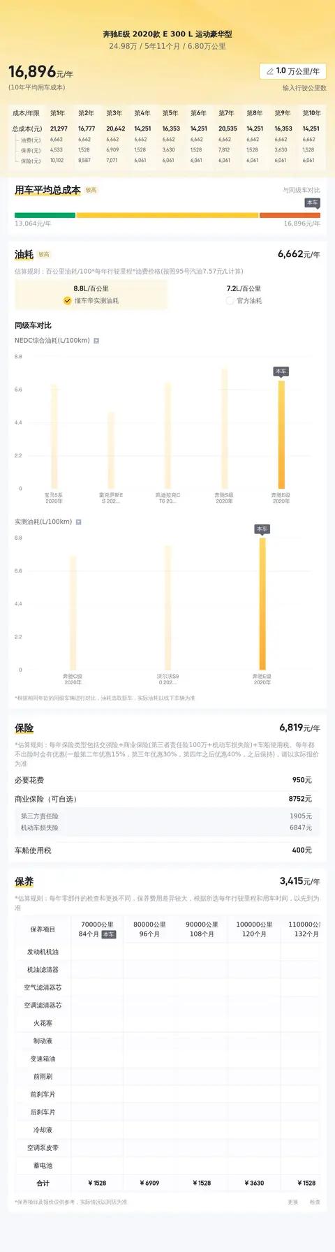 在用车成本方面,根据懂车帝的大数据分析,这台二手奔驰E级 2020款 E 300 L 运动豪华型的10年平均用车成本大约在1.7万元/年,这个费用是包含保险和保养的全部费用。虽然看着也不少,但是在同级别豪华车型里,这个费用还是很有优势的,当然具体费用还是要根据实际使用情况而定。