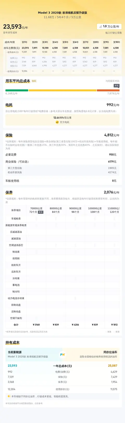 在不考虑其他费用有较大波动的情况下,根据懂车帝对全国Model 3 2020款 标准续航后驱升级版车主的调查,得出的大数据分析结果,该车的10年平均用车成本大约在23699元左右。需要注意的是,实际费用支出可能会因地区差异、个人驾驶习惯维护保养选择等因素而有所不同。