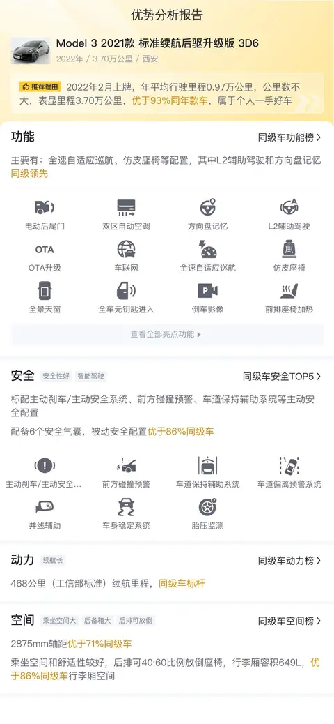 这辆二手2021款Model 3 标准续航后驱升级版 3D6,已累计行驶3.7万公里,于2022年2月在西安上牌,至今未有过户记录,依然保持着最初的那份纯粹与简洁。作为一款电动汽车,它完美展现了特斯拉在绿色出行领域的卓越成就,同时也是一位忠实的记录者,用无声的数字诉说着过去三年多的时间里,车主与它之间的点点滴滴。