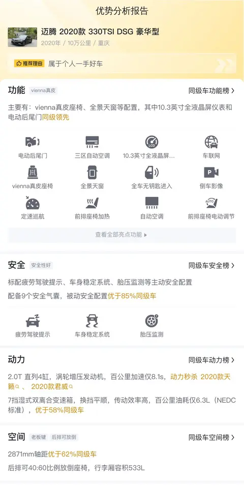 优势:德系车是出了名的皮实耐用,迈腾也继承了这一优点,底盘扎实,行驶质感好,开着放心。其次空间大,尤其是后排,翘二郎腿无压力,适合家庭用。另外,配置还不错,动力也够用,综合来说,属于比较均衡的车型。