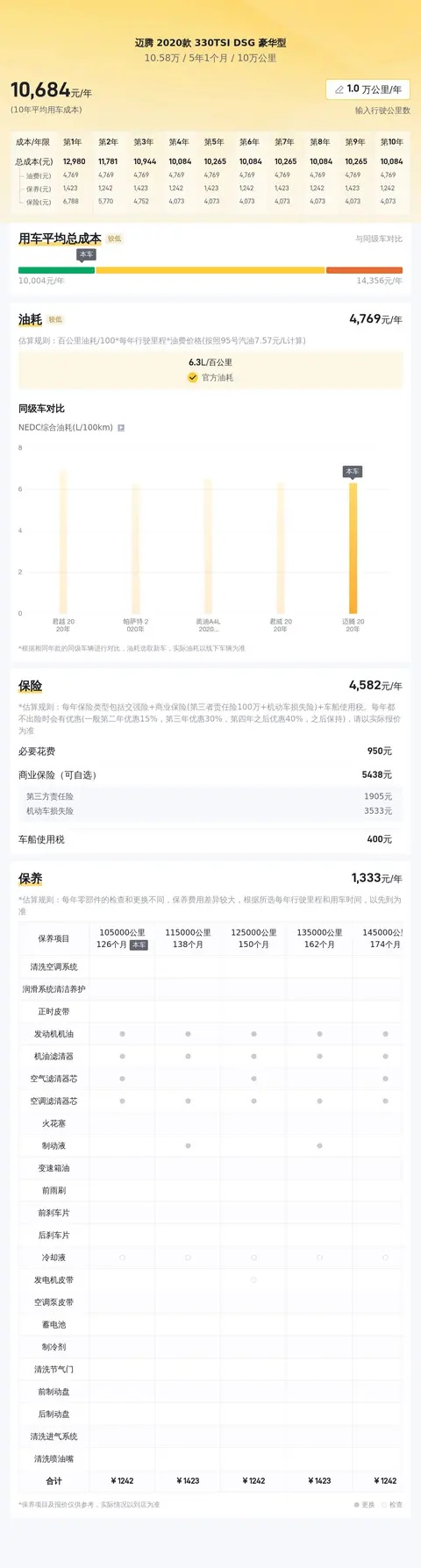据估算,同级车的最低用车成本是6506元/年,最高是13683元/年,迈腾 2020款 330TSI DSG 豪华型是10930元/年,用车成本适中。