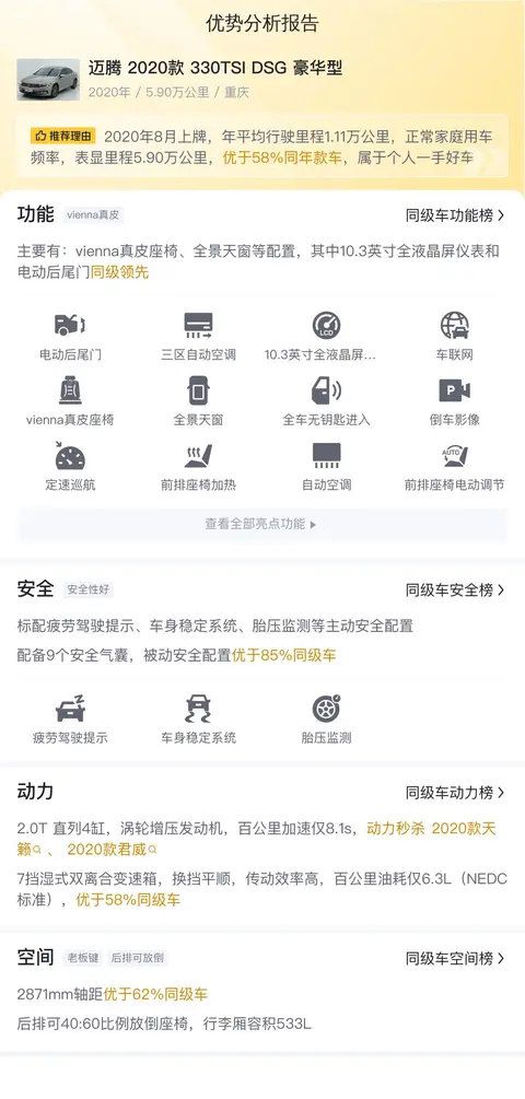 除了价格合理,购买二手车还要考虑用车成本是否实惠,这辆车的百公里油耗为6.3升,按照每年行驶一万公里计算,燃油费用约为5054元,年保养费用约为1739元,年保险费用约为4709元,三年平均每年用车成本约11491元,折合每天成本约为32元,与同级别车型相比,较低的用车成本让这辆车更具竞争力。以上数据来源于懂车帝官网,仅供参考,具体数据请以实际用车成本为准。