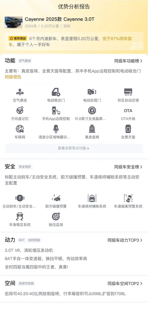 这辆Cayenne在动力性能、内部空间和豪华配置方面表现出色,适合追求驾驶乐趣和舒适性的消费者。然而,其较高的用车成本和维护保养费用可能不适合预算有限的买家。此外,作为一款高性能SUV,燃油经济性不是其强项,环保意识强烈的消费者可能需谨慎考虑。