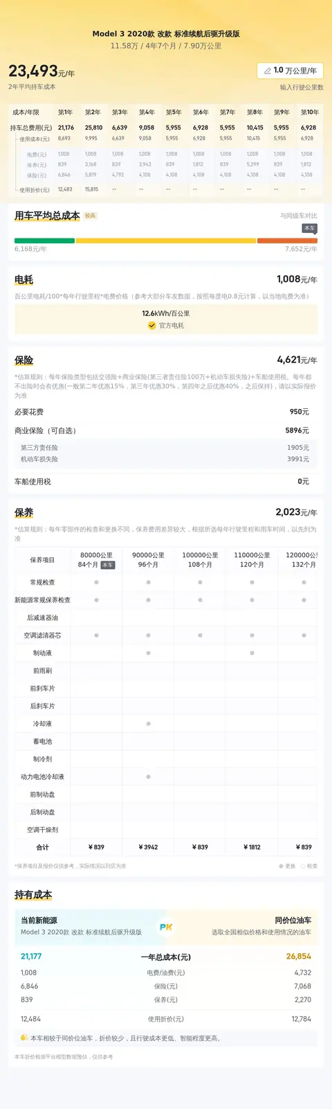 用车成本方面,在百公里电费12.6度,按电价0.62元/度计算,再加上每年4500元左右的保险费用和2000元左右的保养费用,这辆车年均综合用车成本约2.3万元。实际费用支出,依据车主使用情况而定。