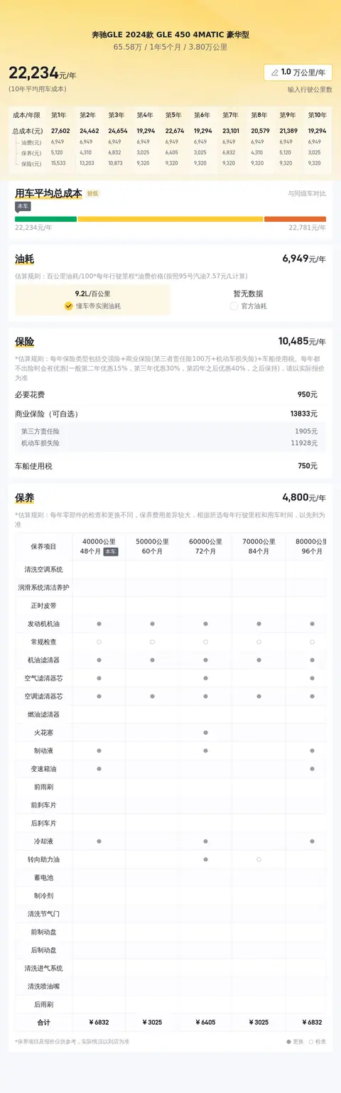 接下来,得跟大伙说说这车的用车成本。根据估算,这辆奔驰GLE 2024款 GLE 450 4MATIC 豪华型的年均综合用车成本大概在每年2.2万元左右。当然了,这得看车主你怎么开,实际花费可能上下有点波动。