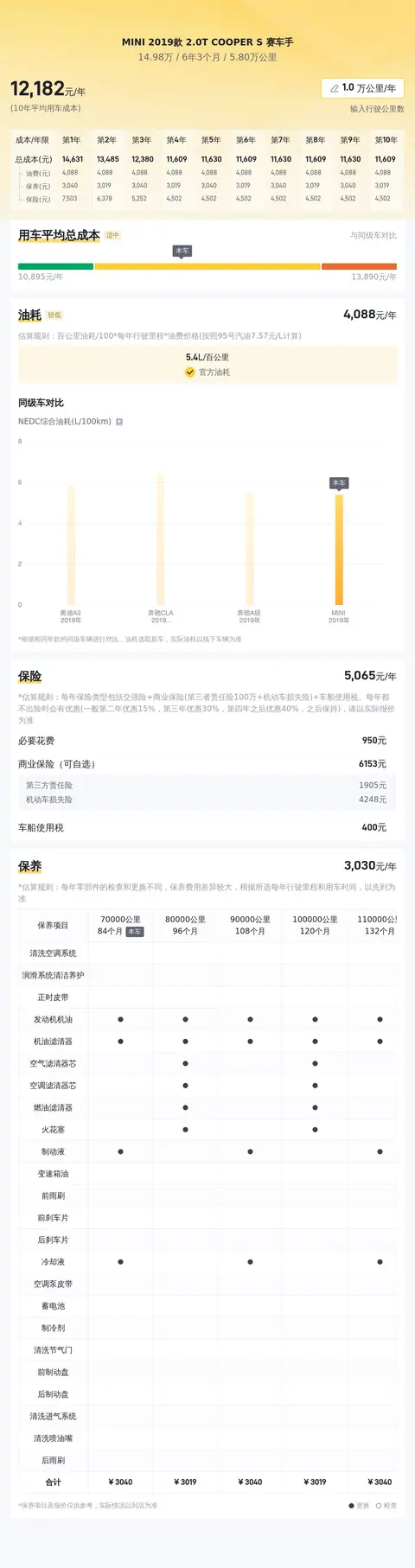 在我们日常用车过程中,用车成本也是我们关心的话题。这辆MINI 2019款 2.0T COOPER S 赛车手,官方给出的百公里油耗为5.4L,但实际受驾驶习惯等因素影响,会有所不同。年度商业保险约4700元,以及每年保养费用约1700元。综合下来,这辆车的用车成本折合每年每公里大约1.46元。