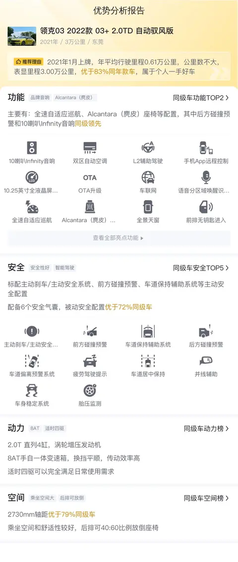 另外,同级车的最低10年平均用车成本是6141元/年,最高是14739元/年,领克03 2022款 03+ 2.0TD 自动驭风版是12072元/年,处于适中的水准,表现不算优秀,但也不拉胯。