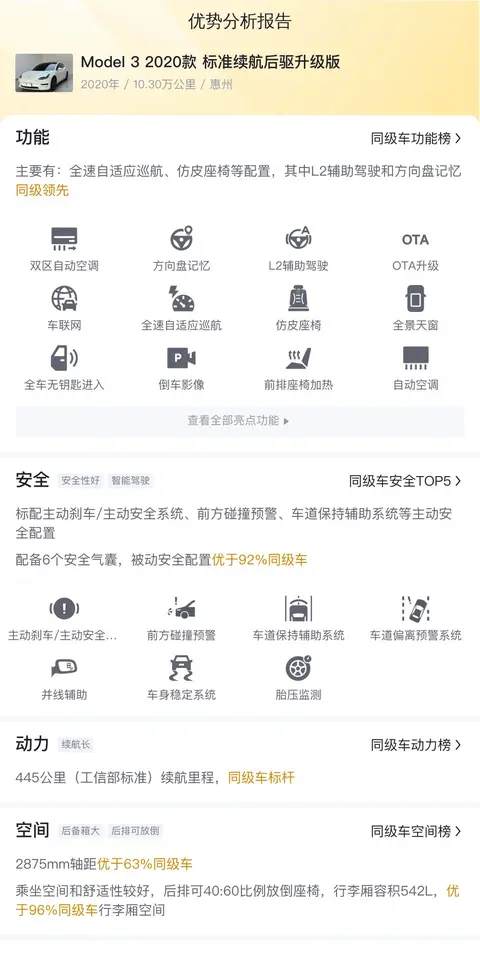 该车在配置方面,主要有全速自适应巡航、仿皮座椅等配置,其中L2辅助驾驶和方向盘记忆同级领先。从安全配置方面来看,整体安全系数一般。在动力方面,这辆车表现优秀,445公里(工信部标准)续航里程,同级车标杆。在空间方面,2875mm轴距优于63%同级车,乘坐空间和舒适性较好,后排可40:60比例放倒座椅,行李厢容积542L,优于96%同级车行李厢空间。