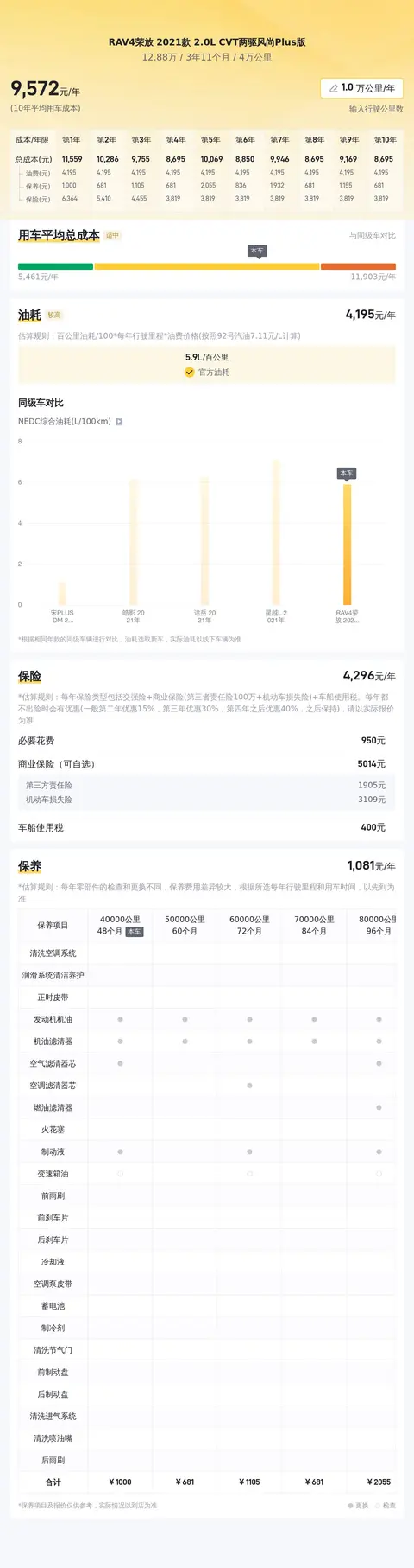 从用车成本来看,根据估算,这辆车的年均综合用车成本约10473元,其中油费约6900元/年,保险费用约3109元/年,保养费用约3109元/年,保养费用约1666元/年。具体费用根据用车场景和使用强度会有所差异。