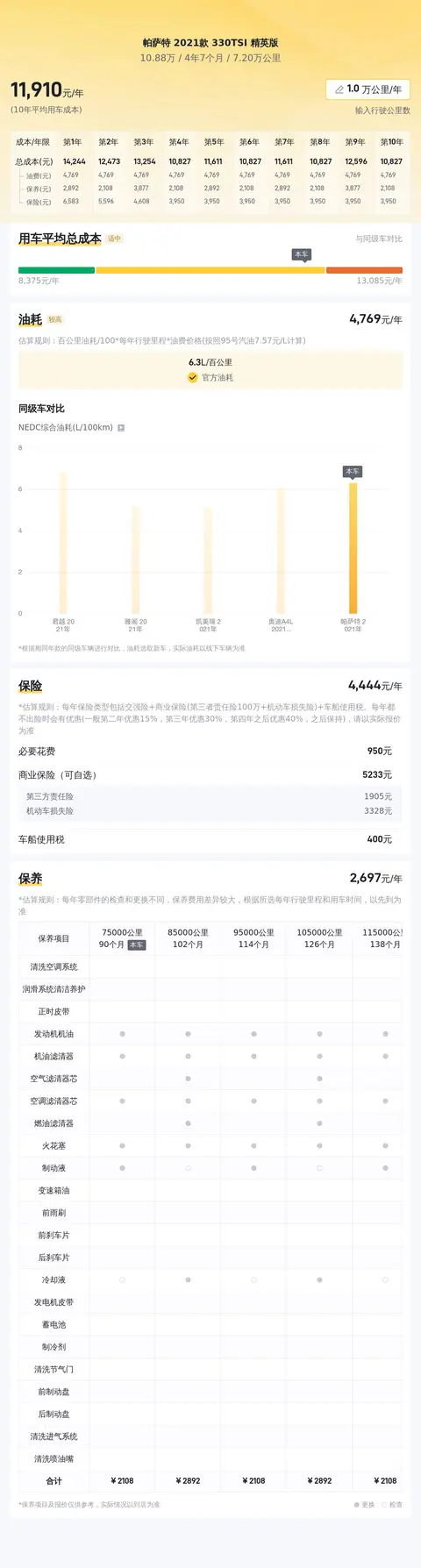 截至目前该车行驶里程7.2万公里,符合该车龄正常用车频率,上牌日期2021年5月,至今车龄4年7个月,期间0过户,用车成本按照每年1.2万元计算,未来两年养车成本大约2.4万元(不包含燃油费)。该车外观完整,无剐蹭和修复痕迹,内饰整洁如新,主要功能均可正常使用。