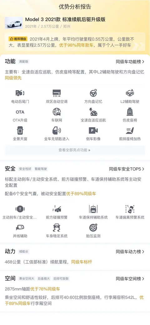 这辆2021年4月上牌的Model 3 2021款 标准续航后驱升级版,车源地郑州,上牌地郑州,车身白色,至今行驶了2.57万公里,个人一手车未过户,新车指导价26.67万,现在二手报价13.69万。
