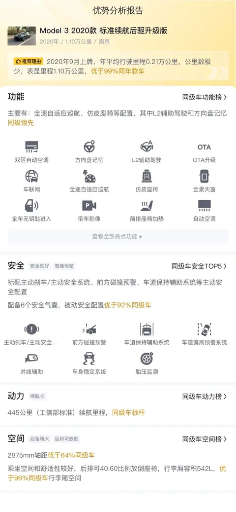 在选择购买车辆时,除了初始购车成本外,还需要考虑日常使用和维护的成本。根据我们的评估,这辆Model 3 2020款 标准续航后驱升级版的年均综合使用成本大约为2.1万元。这里需要注意的是,实际费用可能会根据车主的具体使用习惯和维护情况而有所不同。因此,在做出购买决策之前,建议潜在买家不仅要考虑车辆的购买价格,还要合理预期并规划好车辆的日常运行和保养费用,以确保长期拥有该车辆时能够持续负担得起。