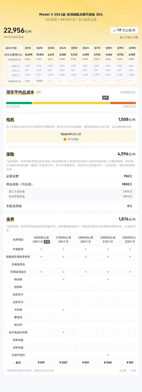 根据当前的市场行情,这辆二手Model 3的售价为10.58万元,从用车成本角度来看,Model 3作为一款电动汽车,在能源消耗方面明显低于传统的燃油车。电力成本通常远低于汽油或柴油成本,这意味着您在日常使用中能够节省一大笔开支。此外,电动汽车的维护成本也相对较低,因为它们的机械结构简单,需要定期更换的零部件较少。然而,需要注意的是,如果涉及到电池或电机等核心部件的维修或更换,成本可能会相对较高。