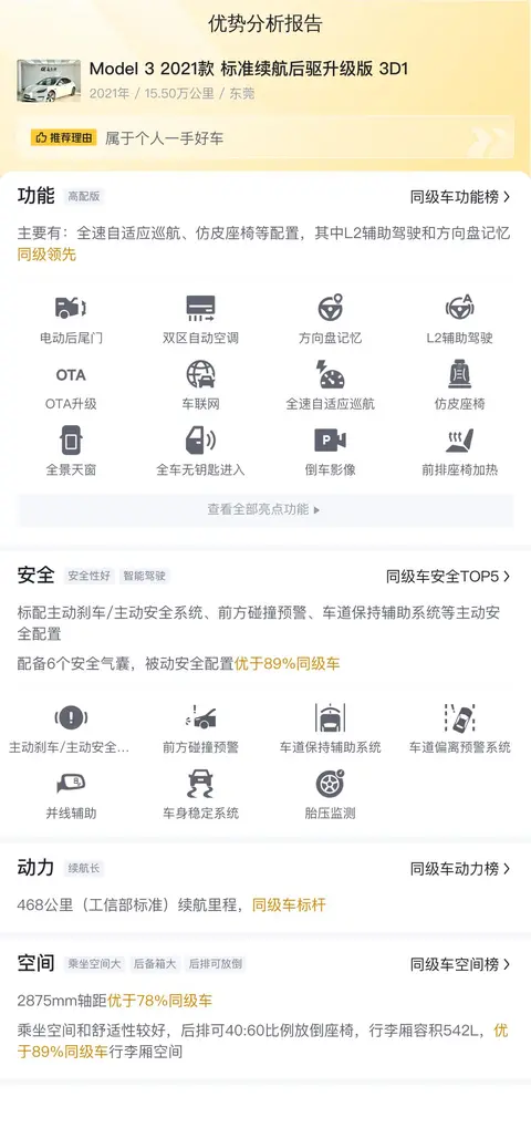 今天我们要介绍的这款车是Model 3 2021款 标准续航后驱升级版 3D1,这款车是2021年2月上牌,车源地和车牌地都是东莞,车身颜色是白色,目前表显里程15.5万公里,没有过户记录。接下来,我们将从各个方面对这款二手车进行详细的解析,以帮助您全面了解其性能、特点以及可能存在的养护挑战。