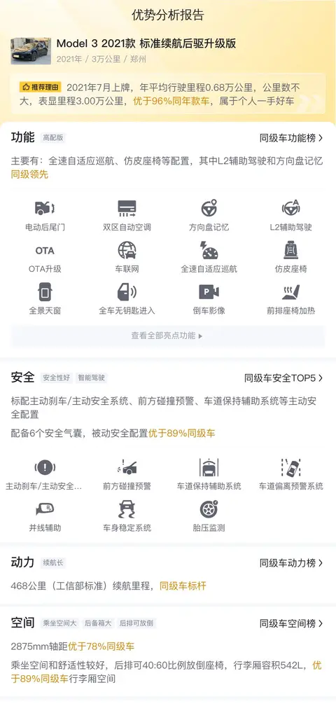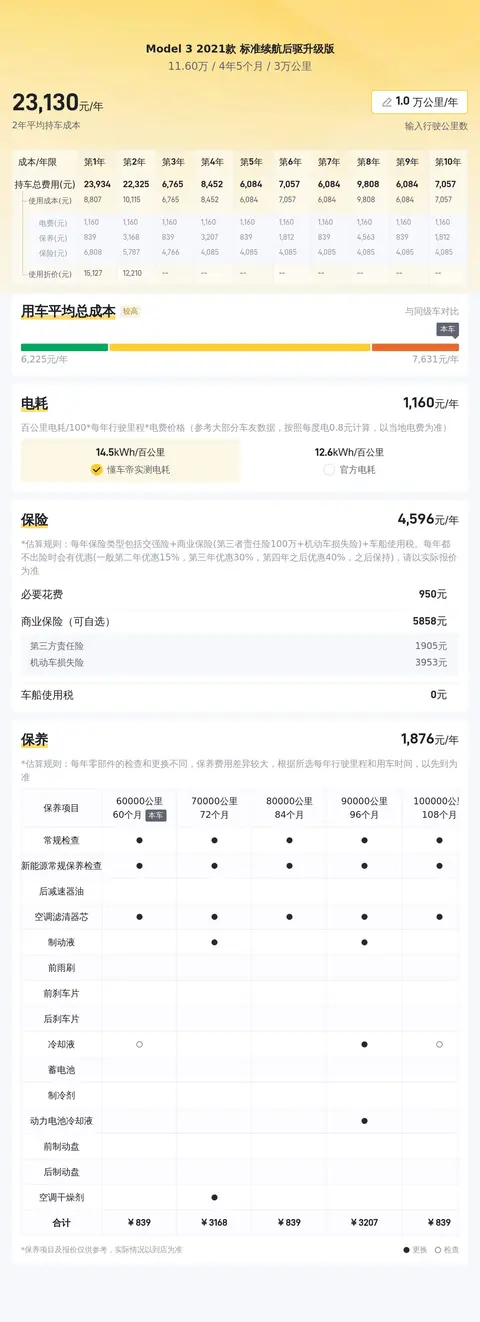就这辆二手特斯拉Model 3 2021款 标准续航后驱升级版而言,根据估算,其十年平均用车成本约为23,560元/年,这一数字相较于同级别车型表现出了明显的经济性优势,体现了特斯拉在成本控制方面的卓越实力。