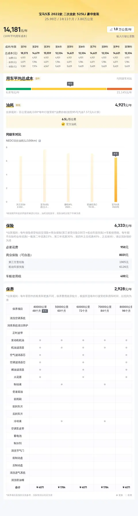 在用车成本方面,10年平均用车成本约为14687元/年,这样的花费,应该说在同级别中表现不错,毕竟开宝马,油耗也不会太低,能有这个表现,还是不错的。