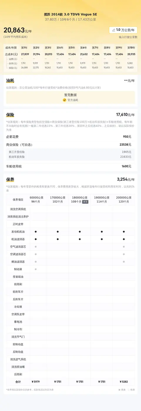 关于这款车的用车成本,我们按照每年行驶2万公里的标准进行了测算,其中包括油费、保养费和保险费三部分,平均每年的用车成本大约为31070元。值得注意的是,这款车的百公里油耗仅为10.9升,这对于一款豪华SUV来说是非常合理的。此外,每年的保养费和保险费也都在合理的范围内。因此,总体来看,这款车的使用成本是相当实惠的。