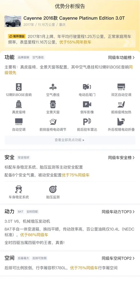 先让我们了解一下这辆二手保时捷Cayenne的基本情况,该车具体版本为——Cayenne 2016款 Cayenne Platinum Edition 3.0T。该车采用黑色车身,2017年1月首次上牌,牌照所在地是淮南,目前车源所在地为重庆。至今累计行驶里程约为11.16万公里。该车当初的新车指导价为98.40万,如今二手车市场的报价为25.68万。车辆有过一次过户记录。