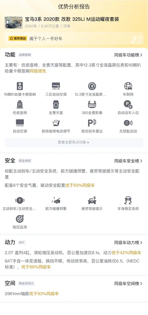 宝马3系 2020款 改款 325Li M运动曜夜套装的优点是配置丰富,尤其是安全配置,令人很放心,加上动力强劲,是一款值得考虑的车。
