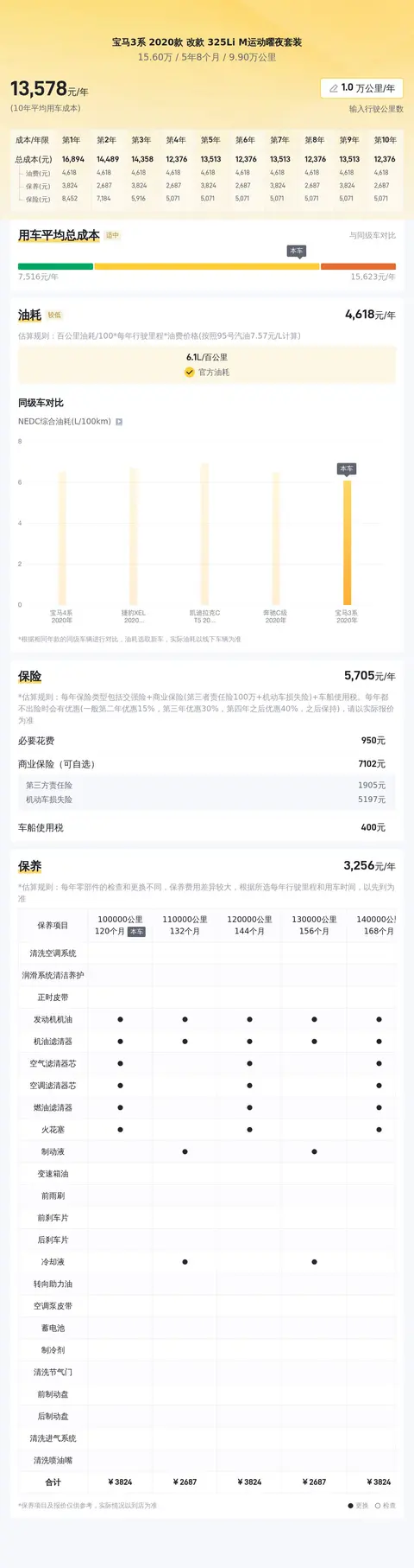宝马3系 2020款 改款 325Li M运动曜夜套装的10年平均用车成本约13617元/年,6.1L的油耗表现,养车算是正常支出。