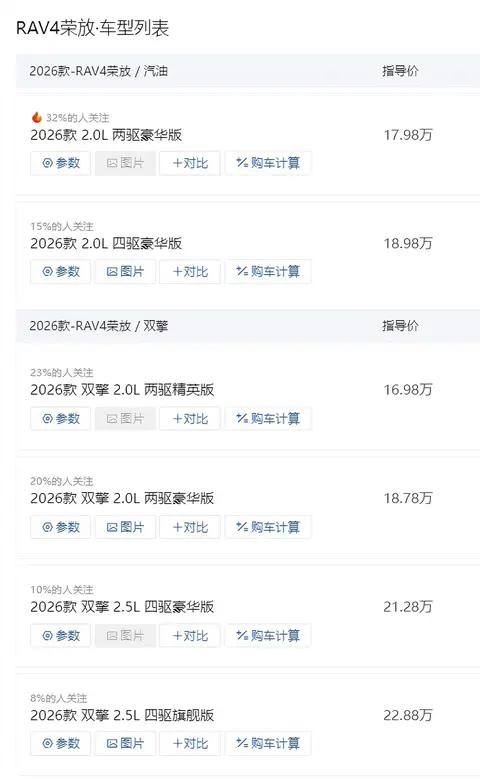 2026款丰田RAV4荣放(图片|配置|询价),里里外外可以说是焕然一新,有不少车友对该车感兴趣,但不知道选纯油还是双擎,选两驱还是四驱,笔者通过对比,给出推荐选购意见。