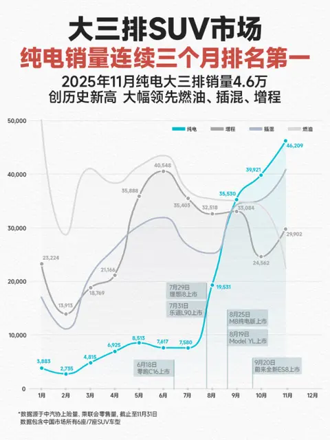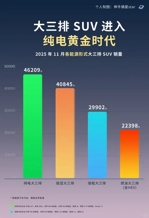 十一月中国车市的销量榜单,戏剧性地凸显了一条新的竞争战线。纯电大型三排座SUV以合计约4.6万台的月销量,实现了对同级别其他技术路线车型的强势领先。这不仅仅是数字的超越,更像是一场由用户发起、用订单投票的“产品力公投”,其结果清晰地表明,在满足家庭高品质出行需求的核心赛道上,纯电架构的综合体验已经占据了上风。