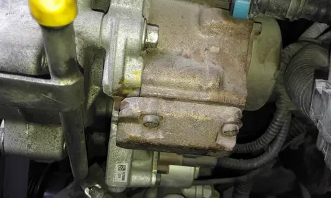 我还特意的拍了一下皮带绕法,生怕后续在安装时会忘记。随后我又拆掉正时皮带上的塑料护罩,7个螺丝很容易就能拿下来,露出正时皮带涨紧轮时,我就能看到皮带已经被拉长。指针早就已经不在凹槽内,表面还有一些磨损的痕迹,看来确实要及时的更换。在拆卸的过程中,比较费劲的就是高压泵,还有水泵,因为没有小拉马,面对水泵带轮,我费了好大劲才拆卸下来。高压泵上的三个固定螺丝位置比较刁钻,有两个藏得很深,只能一点点的拧下来,好不容易全部卸下来。拆正时皮带之前,我严格按照要求对准标记,用内角扳手放入到排气带轮定位孔固定。