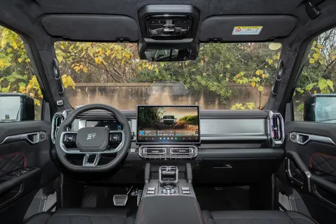 底盘部分配备了 7 块钢制护板,全面覆盖了发动机、变速箱、电池组等关键部件,防止在越野时被石块等障碍物刮擦损坏,提升了底盘的防护能力。28 度接近角、30 度离去角和 700 毫米涉水深度的设计,确保了车辆在面对陡坡、坑洼路面和涉水路段时具备良好的通过性,能够顺利通过大多数复杂地形。坦克转向功能的加入,将车辆的最小转弯半径控制在 4.785 米,提升了车辆在狭窄路段和复杂地形中的灵活性,让驾驶员能够更轻松地操控车辆完成转向和掉头操作。从实际越野体验来看,这些配置使得车辆能够应对大多数非铺装路面,无论是山路、土路还是砂石路,都能保持较好的通过性和稳定性。不过,对于极端越野环境,由于受到车辆自身设计和性能参数的限制,建议用户根据具体的越野需求进行选择,避免强行通过超出车辆能力范围的路况,以免对车辆造成损坏。