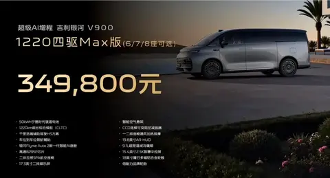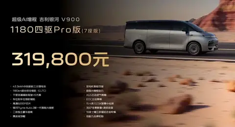 日前,我们从吉利银河官方获悉,吉利银河V900(图片|配置|询价)开启预售,共推出三款车型,预售价区间为31.98-38.98万元。吉利银河V900定位为一款中大型MPV,提供6、7、8座布局。车辆将搭载1.5T发动机+双电机组成的增程动力系统,CLTC纯电续航为260km,满油满电综合续航为1220km。同时,新车还将配备激光雷达,提供千里浩瀚辅助驾驶H5方案。