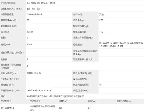 同样同步申报普通版+AMT自动挡版本。发动机来自隆鑫,最大功率20.5kW,与老款数据一致。因车身结构重新设计,整备质量比老款略增重,普通版175kg,