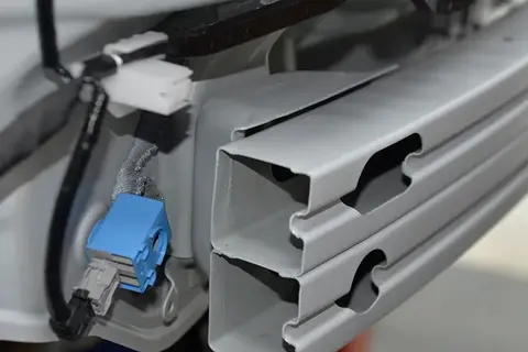 这辆车的副防撞梁与老款一样,都是口字形截面的铝合金梁,并且配备了带有溃缩褶皱的吸能盒。