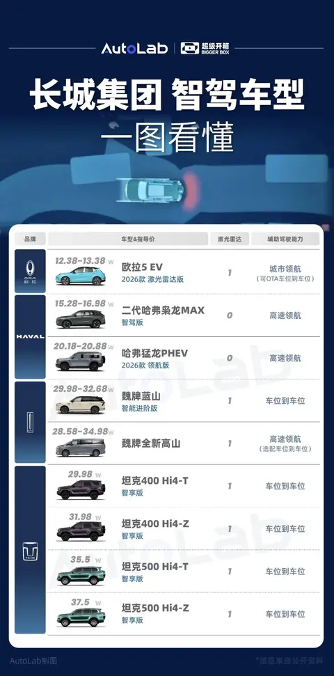 我们整理了一份榜单,带你一图了解长城集团的智驾车型。